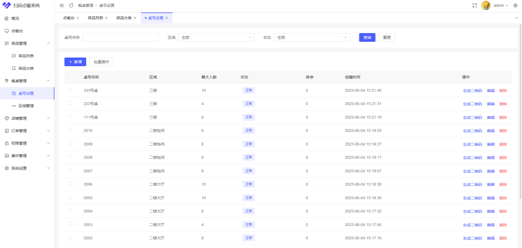 - 桌号管理:商户可以对店铺中的就餐桌进行编号,并录入到系统中,就可以通过系统对餐桌进行管理。